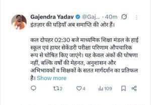 शिक्षा मंत्री गजेंद्र यादव ने विद्यार्थियों को शुभकामनाएं देते हुए कहा कि सभी छात्र सकारात्मक सोच के साथ अपना परिणाम देखें। उन्होंने यह भी कहा कि परीक्षा जीवन का एक हिस्सा है और आगे बढ़ने के कई अवसर हमेशा खुले रहते हैं।