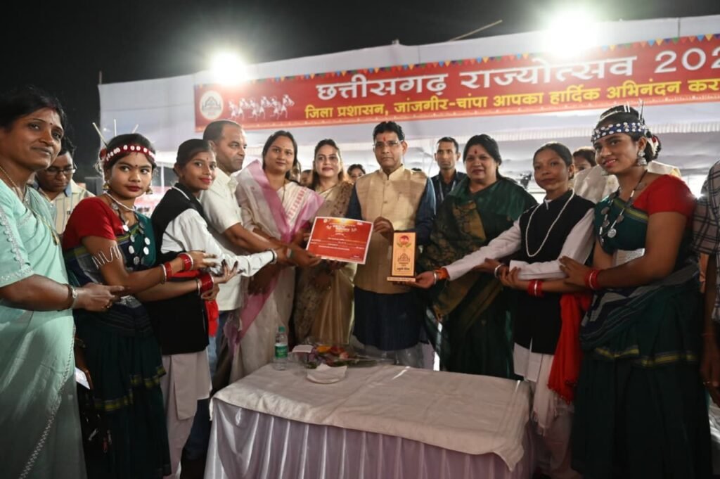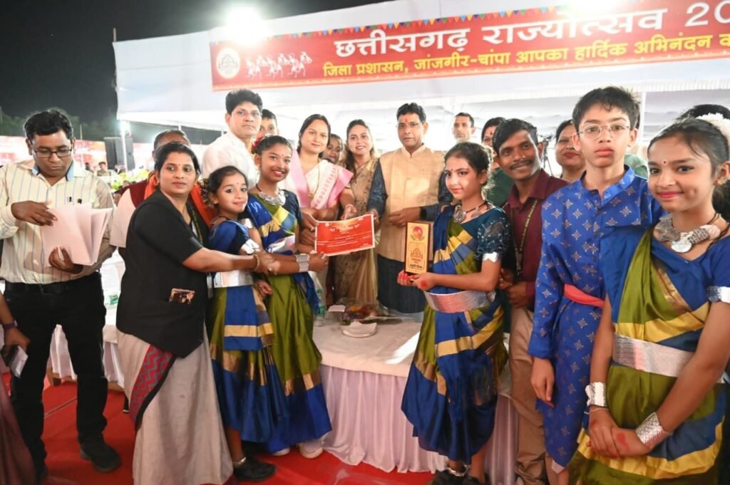 जांजगीर-चांपा 04 नवम्बर 2025। छत्तीसगढ़ राज्य के स्थापना दिवस के अवसर पर जिले में तीन दिवसीय राज्योत्सव कार्यक्रम का समापन हुआ। शासकीय हाई स्कूल मैदान जांजगीर में 2 से 4 नवम्बर तक आयोजित इस राज्योत्सव के समापन समारोह में मुख्य अतिथि के रूप में राजस्व एवं आपदा प्रबंधन, खेल एवं युवा कल्याण मंत्री श्री टंकराम वर्मा शामिल हुए। कार्यक्रम में राजस्व एवं आपदा प्रबंधन मंत्री श्री वर्मा सहित अतिथियों ने विभिन्न विभागों द्वारा लगाई गई प्रदर्शनी का भी अवलोकन किया, जिसमें छत्तीसगढ़ राज्य के 25 वर्षों में हुए विकास कार्यों, नवाचारों और योजनाओं की उपलब्धियों को प्रदर्शित किया गया था। साथ ही विभिन्न विभागों द्वारा शासन की जनकल्याणकारी योजनाओं से पात्र हितग्राहियों को सम्मानित किया गया। इस अवसर पर स्कूली छात्र-छात्राओं एवं स्थानीय कलाकरों की शानदार प्रस्तुतियों दी। साथ ही राज्योत्सव मंच पर स्थानीय कलाकारों द्वारा प्रस्तुत छत्तीसगढ़ी नृत्य, लोकगीत जैसी प्रस्तुतियों ने दर्शकों का मन मोह लिया।