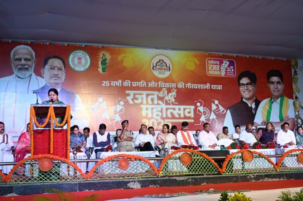उन्होंने कहा कि हमारे मुख्यमंत्री श्री विष्णु देव साय छत्तीसगढ़ को विकास की राह में आगे ले जा रहे हैं विकसित भारत के सपने को साकार कर रहें है। कभी हमारे बच्चे उच्च शिक्षा के लिए प्रदेश से बाहर जाया करते थे, परंतु आज रायपुर और प्रदेश के हर कोने में उच्च शिक्षण संस्थान खुल गए हैं। आज जब छत्तीसगढ़ अपनी रजत जयंती (25 वर्ष) मना रहा है। तभी हमारे प्रधानमंत्री श्री नरेंद्र मोदी जी ने राजधानी रायपुर से करोड़ों के विकास कार्यों का शुभारंभ और भूमिपूजन किया है। यह केवल परियोजनाएँ नही बल्कि छत्तीसगढ़ के उज्ज्वल भविष्य के मील के पत्थर हैं। हमारी मातृशक्ति को सशक्त करने के लिए महतारी वंदन योजना जैसी पहल की है, जिससे हर माँ, हर बहन को सम्मान, सुरक्षा और आत्मनिर्भरता का अवसर मिल रहा है। वर्तमान में प्रदेश में विकास की गति तेज हुई है,और जनता के जीवन में सुख-समृद्धि आई है। आज हमारा छत्तीसगढ़ विकसित भारत की दिशा में अग्रसर है। हमारी संस्कृति, हमारी पहचान और हमारे प्रयास मिलकर इस राज्य को शक्ति, समृद्धि और स्वाभिमान का प्रतीक बना रहे हैं।