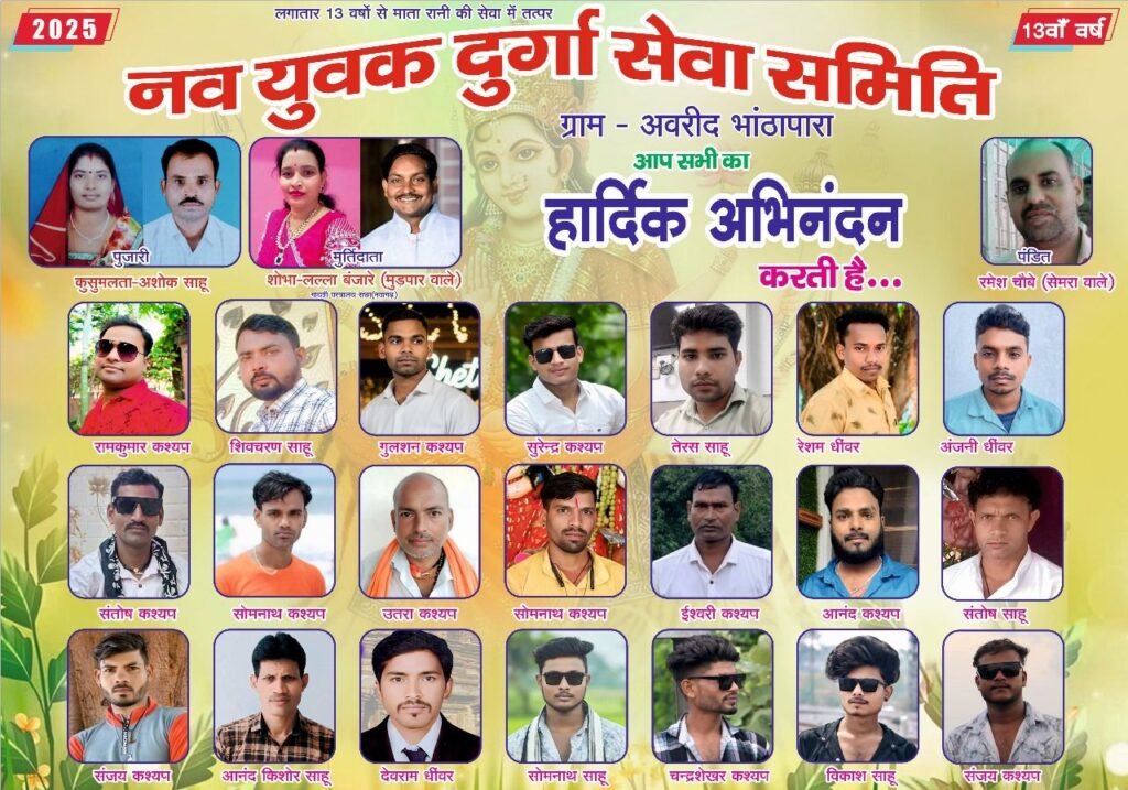 नव युवक दुर्गा सेवा समिति के सदस्य – कुसुमलता-अशोक साहू (पुजारी),,आनंद किशोर साहू, संतोष साहू, सोमनाथ कश्यप, ईश्वरी कश्यप, संतोष कश्यप, सोमनाथ (भुरू) कश्यप, सुरेंद्र कश्यप ,आकाश साहू, उत्तरा कश्यप, शिवचरण साहू, रामकुमार कश्यप, रेशम धीवर, अंजनी कुमार धीवर,तेरसराम साहू, गुलशन कश्यप,आनंद कश्यप,संजय कश्यप, चंद्रशेखर कश्यप, संजय कश्यप (गोलु),, सोमनाथ साहू(सोमू),,देवराम धीवर ,,, एवं लोमश चौबै, रमेश चौबे (पंडित) सहित भारी संख्या मे ग्रामीण जन उपस्थित रहे’,,,,,